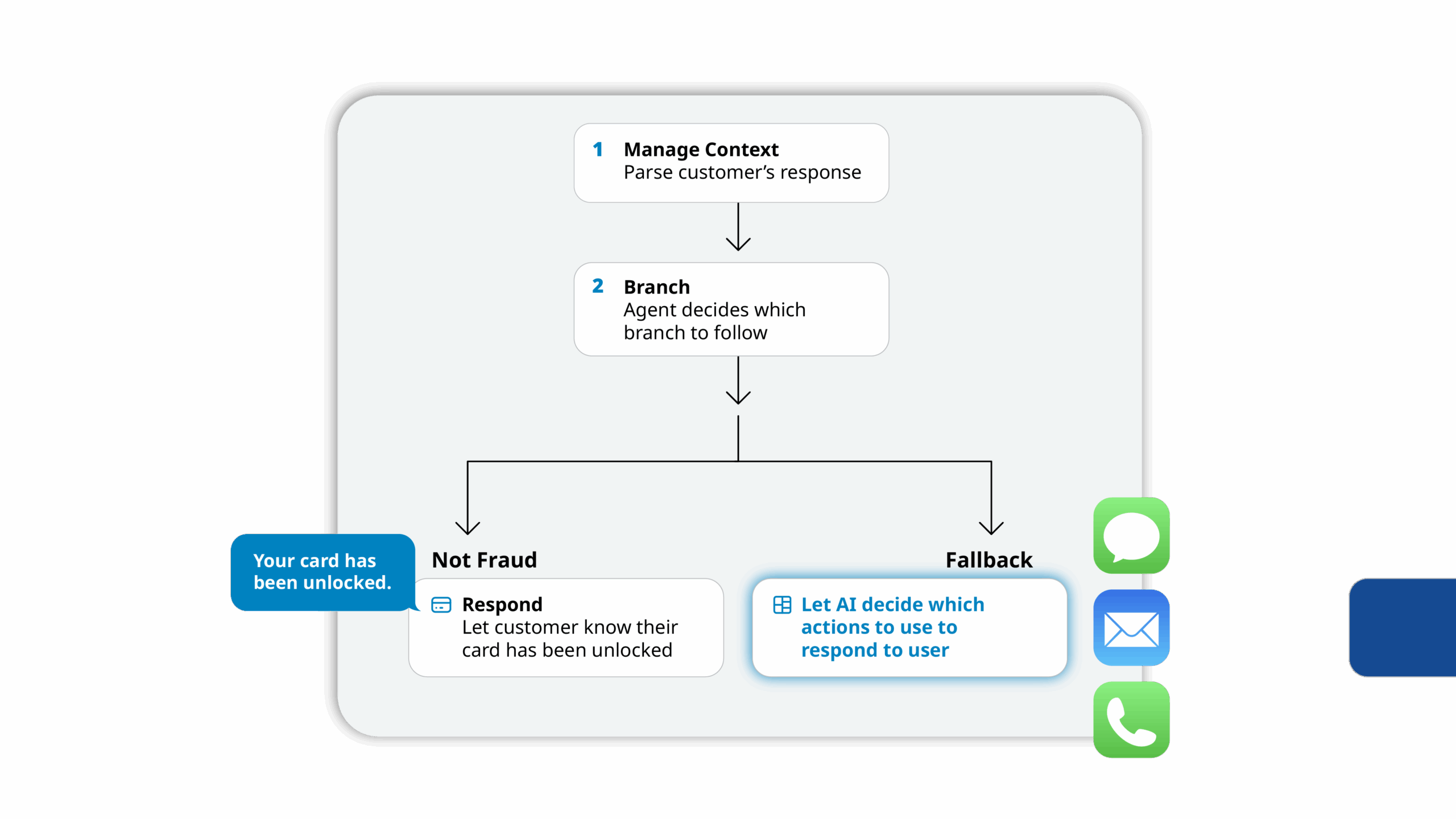 Designed for business users, the agent builder enables teams to create and deploy modular, configurable agents that only activate when needed. Each agent is designed to handle a specific task—for example, fraud resolution, password recovery, or billing explanation.